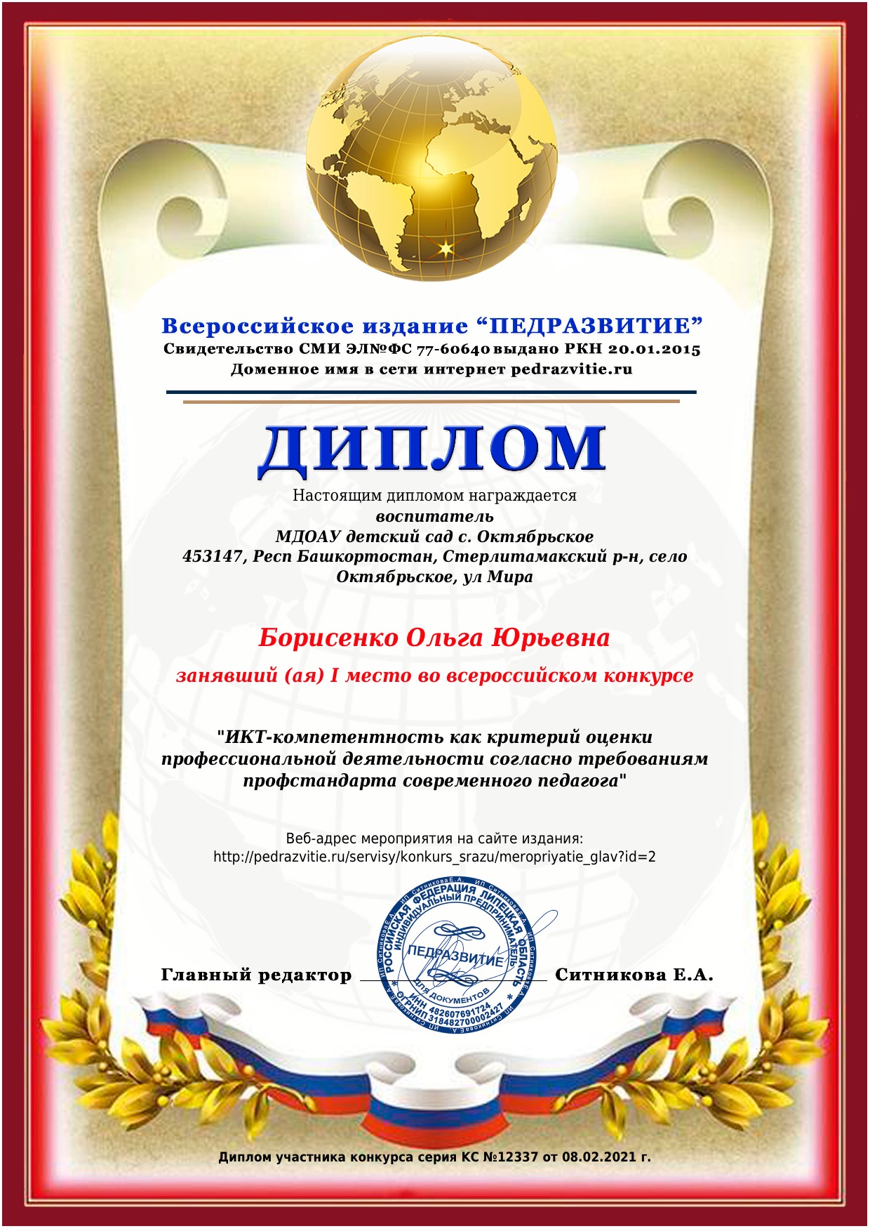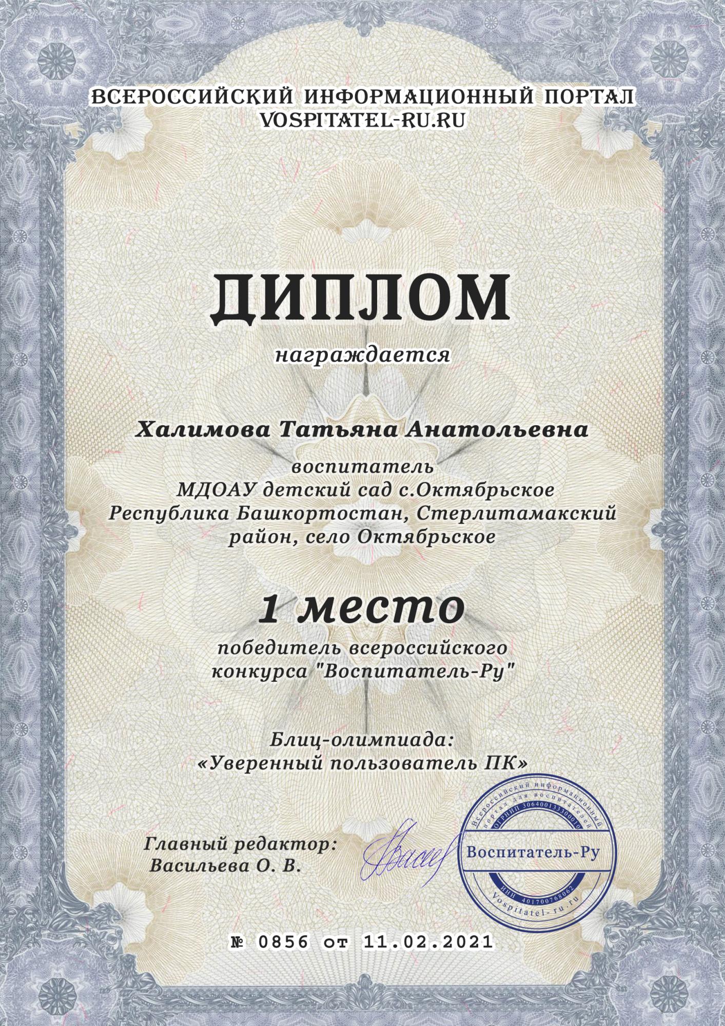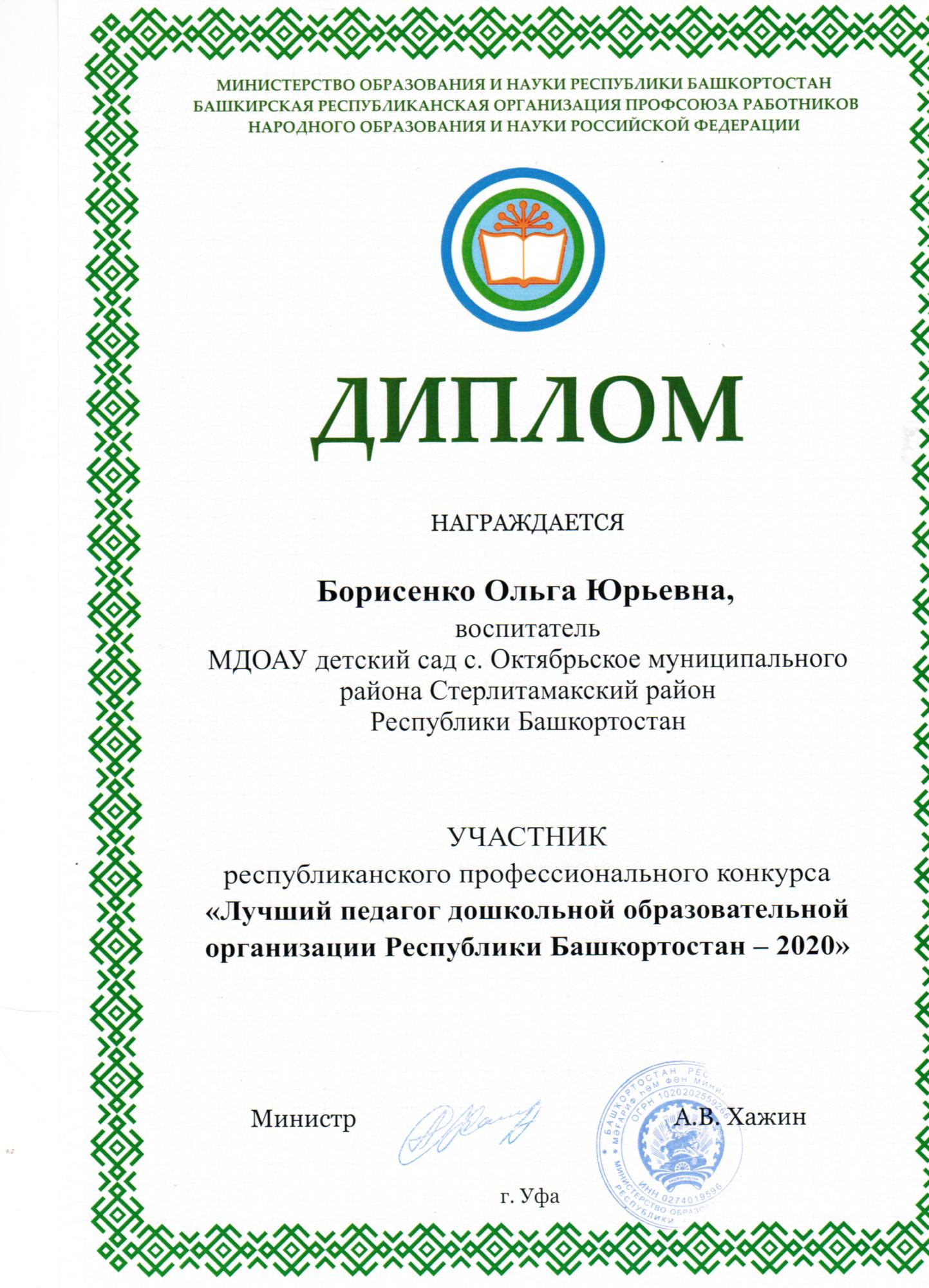 Диплом участника республиканского конкурса педагогического мастерства " Лучший педагог дошкольной организации Республики Башкортостан -2020"